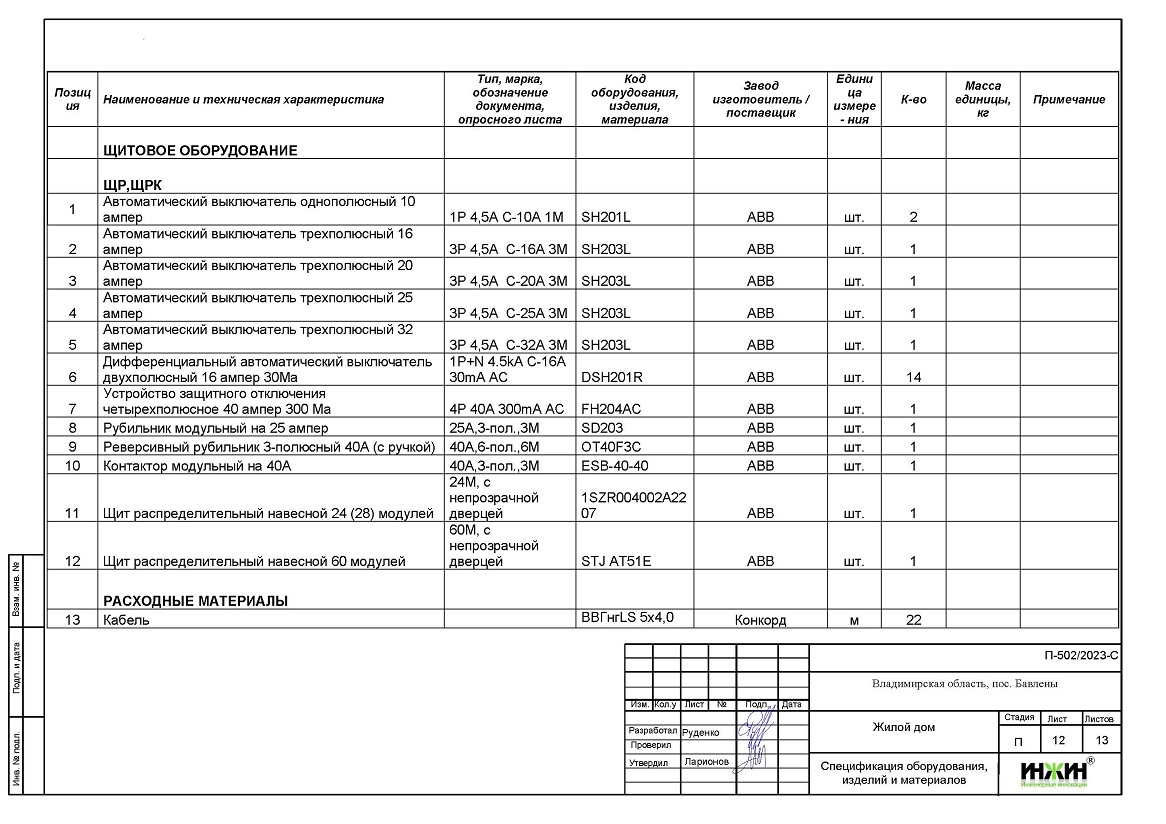 5. Спецификация материалов и оборудования по электрике и электропроводке дома в пос. Бавлены, Владимирской области.