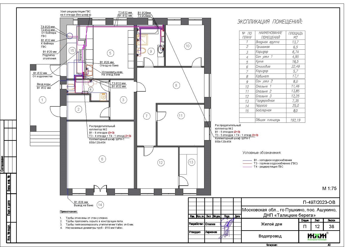 o Схема внутреннего водоснабжения дома – коллекторно-лучевая с рециркуляцией горячей воды через полотенцесушители, выполнен расчет 24-х точек водоснабжения и полотенцесушителей;