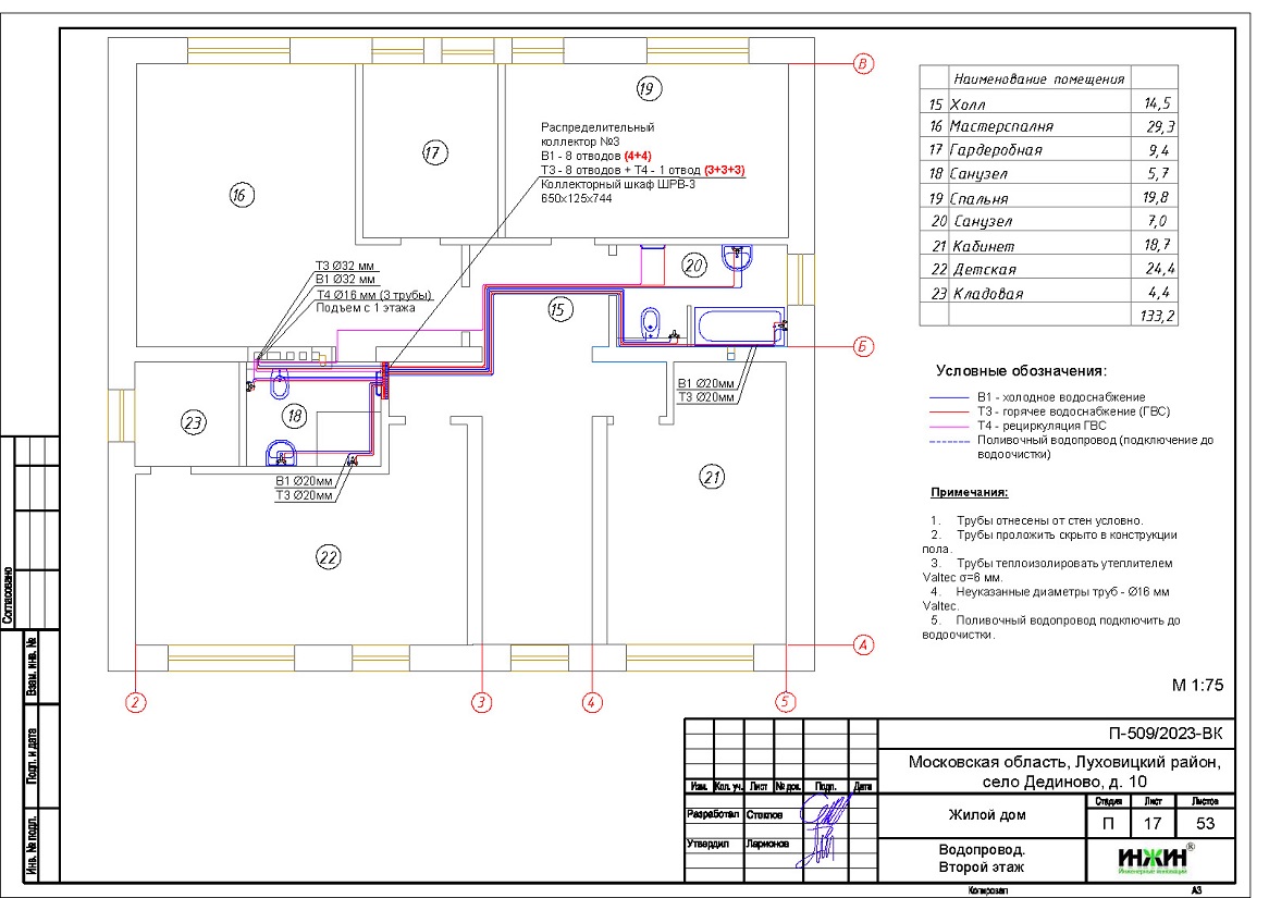 o Схема внутреннего водоснабжения дома – коллекторно-лучевая с рециркуляцией горячей воды через водяные полотенцесушители и коллекторы, выполнен расчет 37-и точек водоснабжения и полотенцесушителей;
