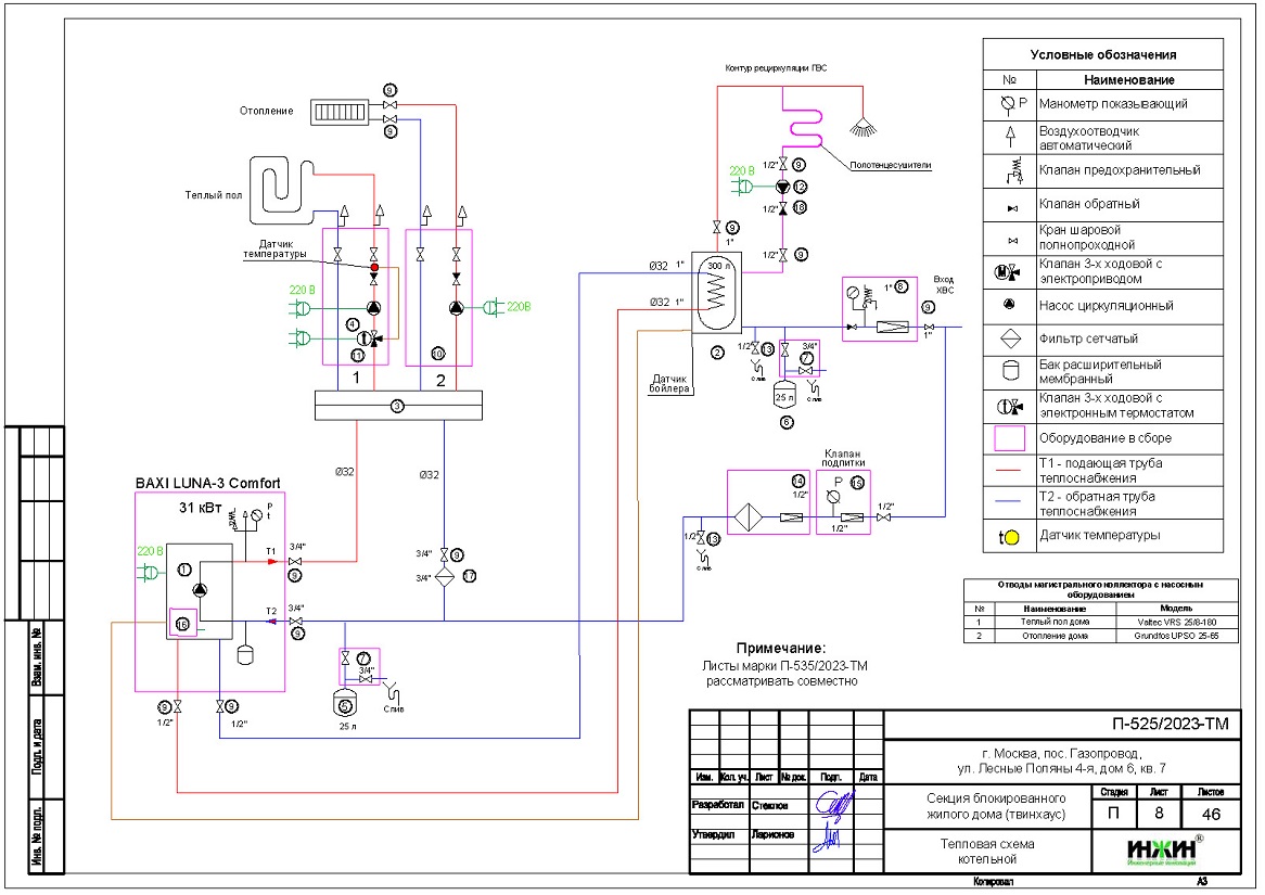 Объем проекта отопления, канализации и водоснабжения дома в пос. Газопровод, г. Москва: 46 листов.