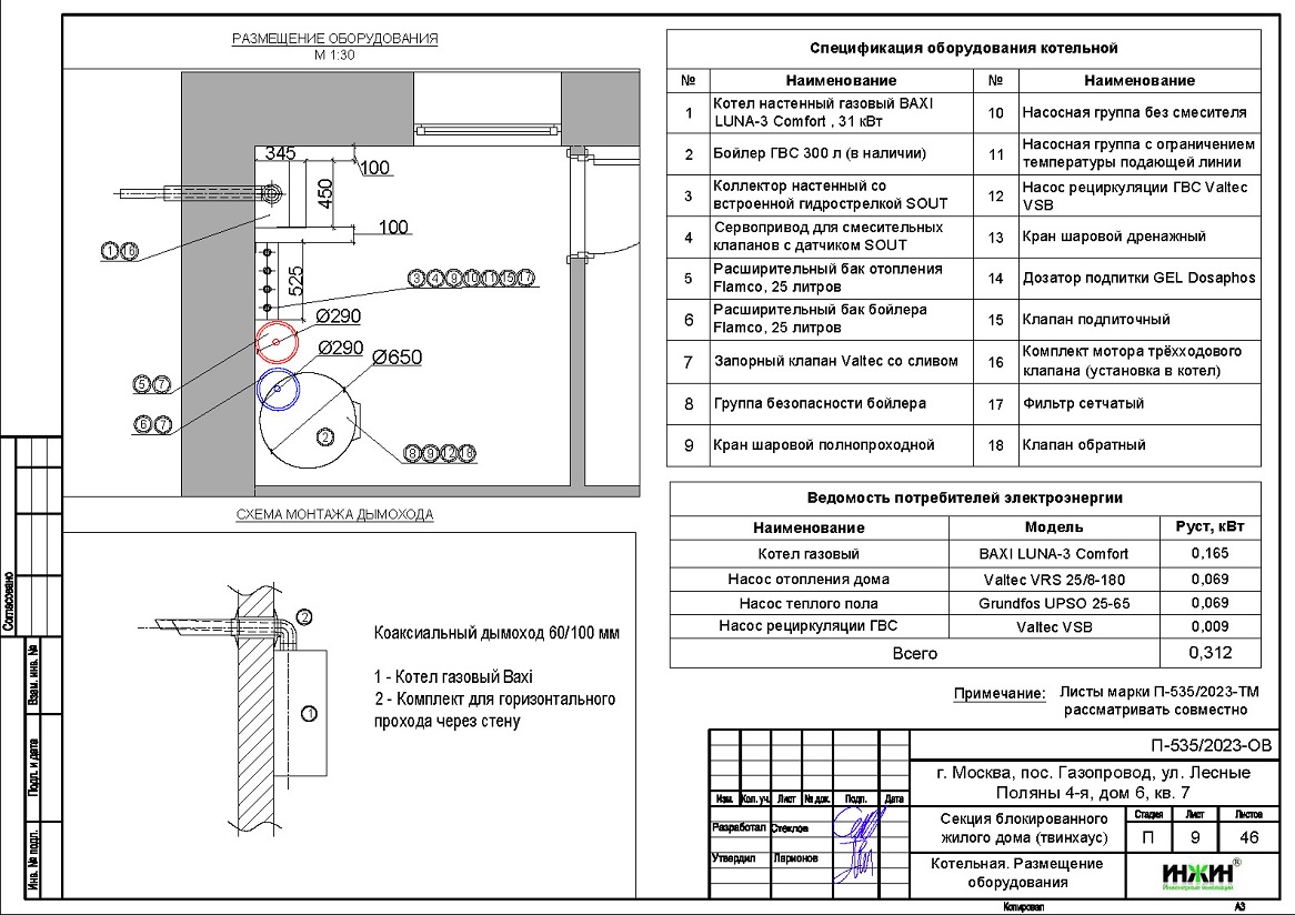 Состав проекта котельной, отопления, канализации и водоснабжения дома в пос. Газопровод, г. Москва: