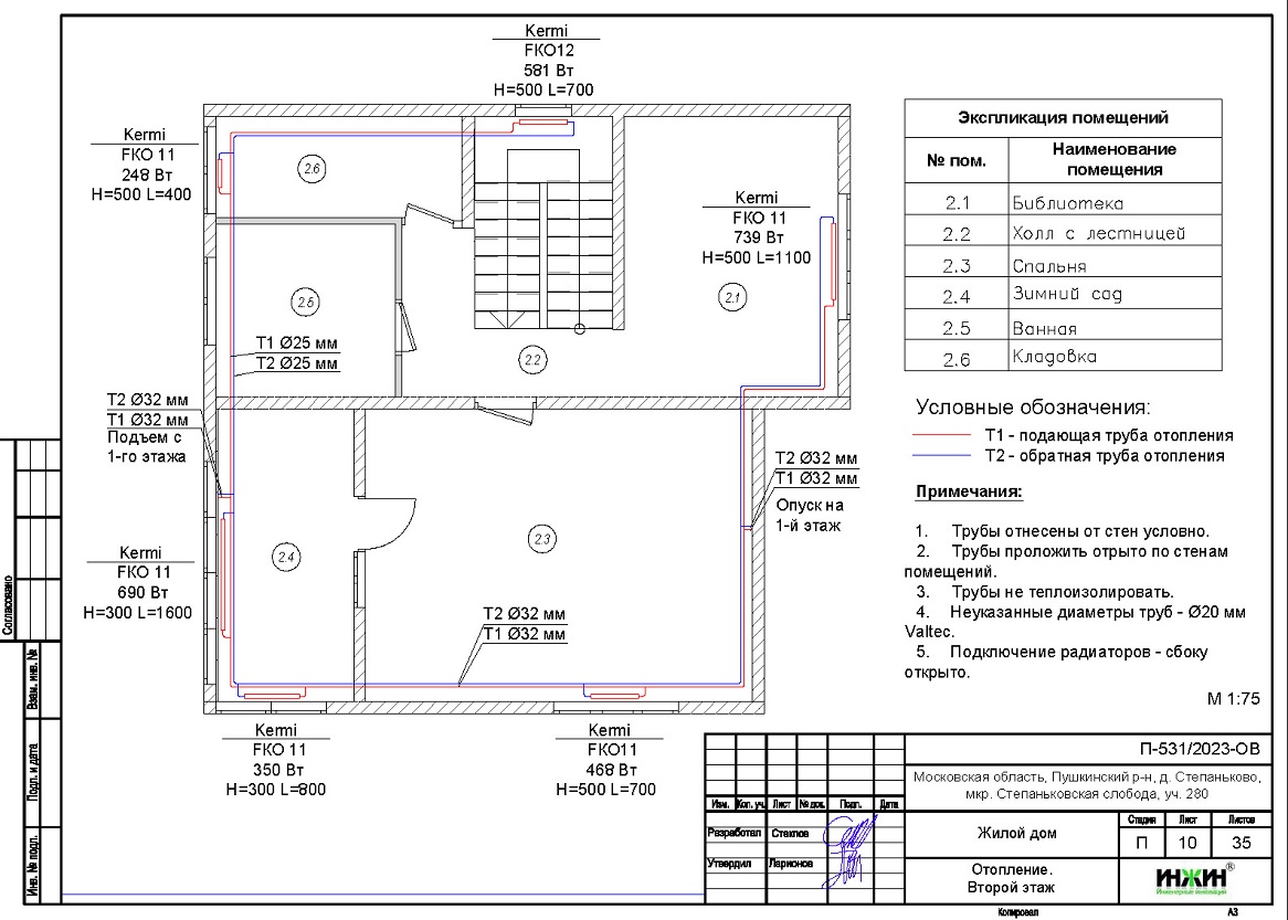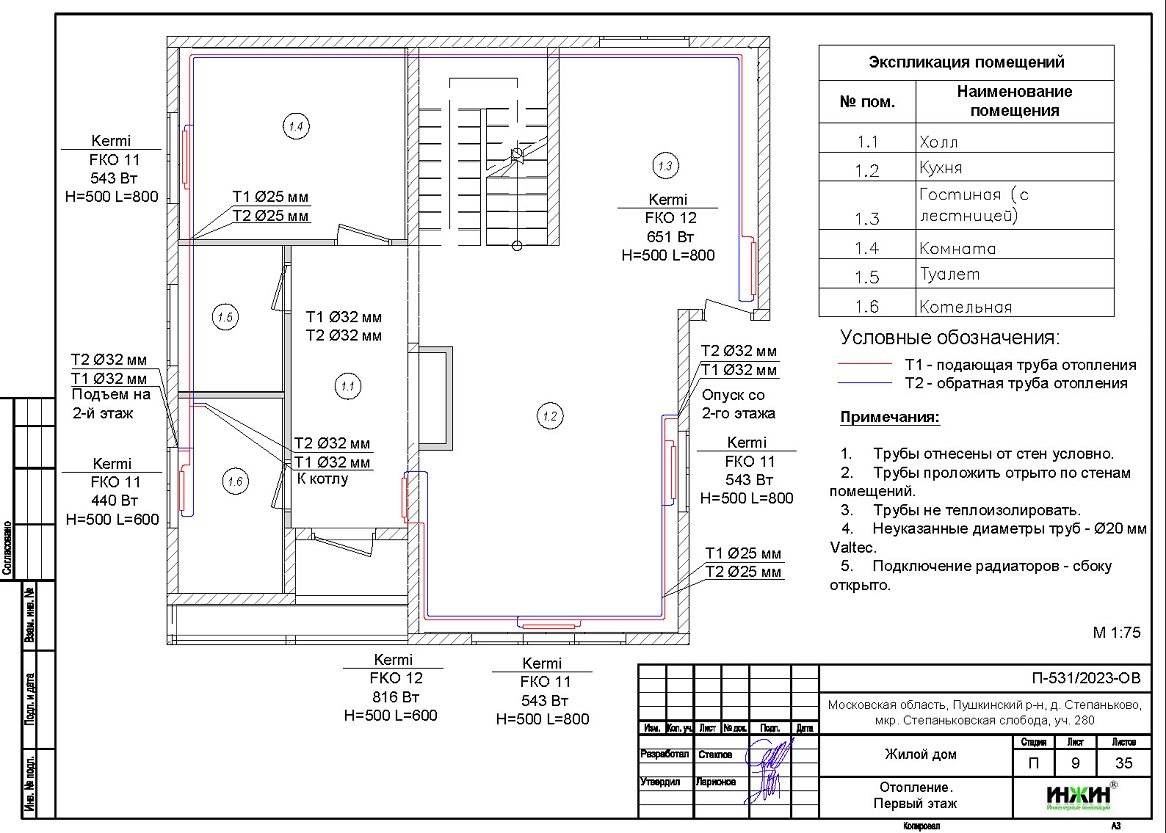 Объем проекта отопления, канализации и водоснабжения дома в д. Степаньково: 35 листов.