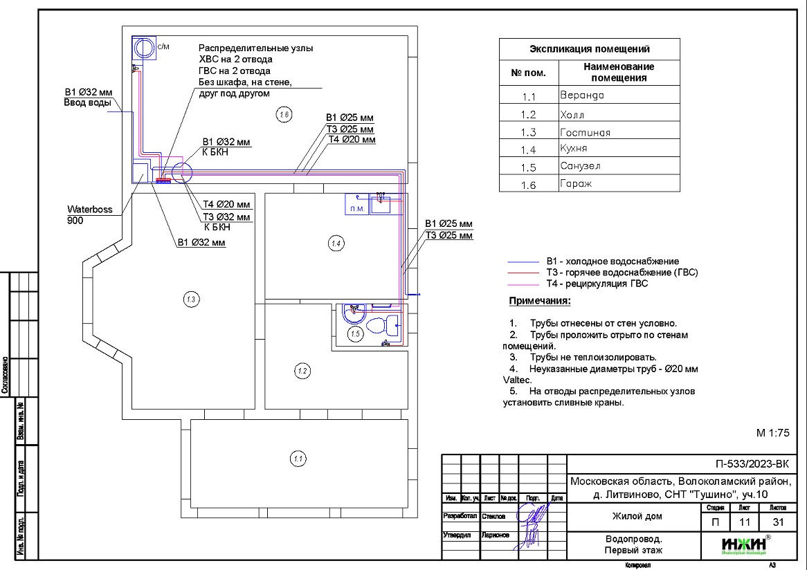 Внутренний водопровод дома в СНТ "Тушино" (проект водоснабжения).