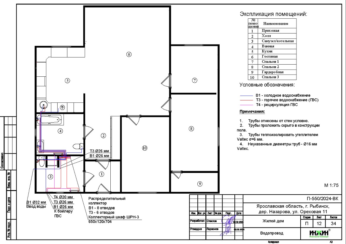 o Схема внутреннего водоснабжения дома – коллекторно-лучевая с рециркуляцией горячей воды через водяные полотенцесушители, выполнен расчет 14-ти точек водоснабжения и полотенцесушителей;