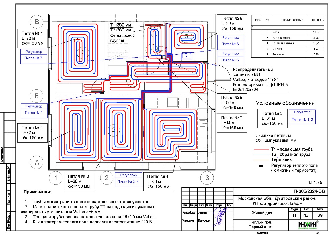 o Водяной теплый пол в доме предусмотрен на площади 65 м.кв., коллектор теплого пола Valtec на 7 отводов, всего 7 петель;