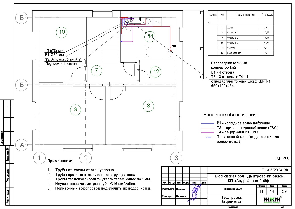 o Схема внутреннего водоснабжения дома – коллекторно-лучевая с рециркуляцией горячей воды через водяные полотенцесушители, выполнен расчет 17-ти точек водоснабжения и полотенцесушителей;
