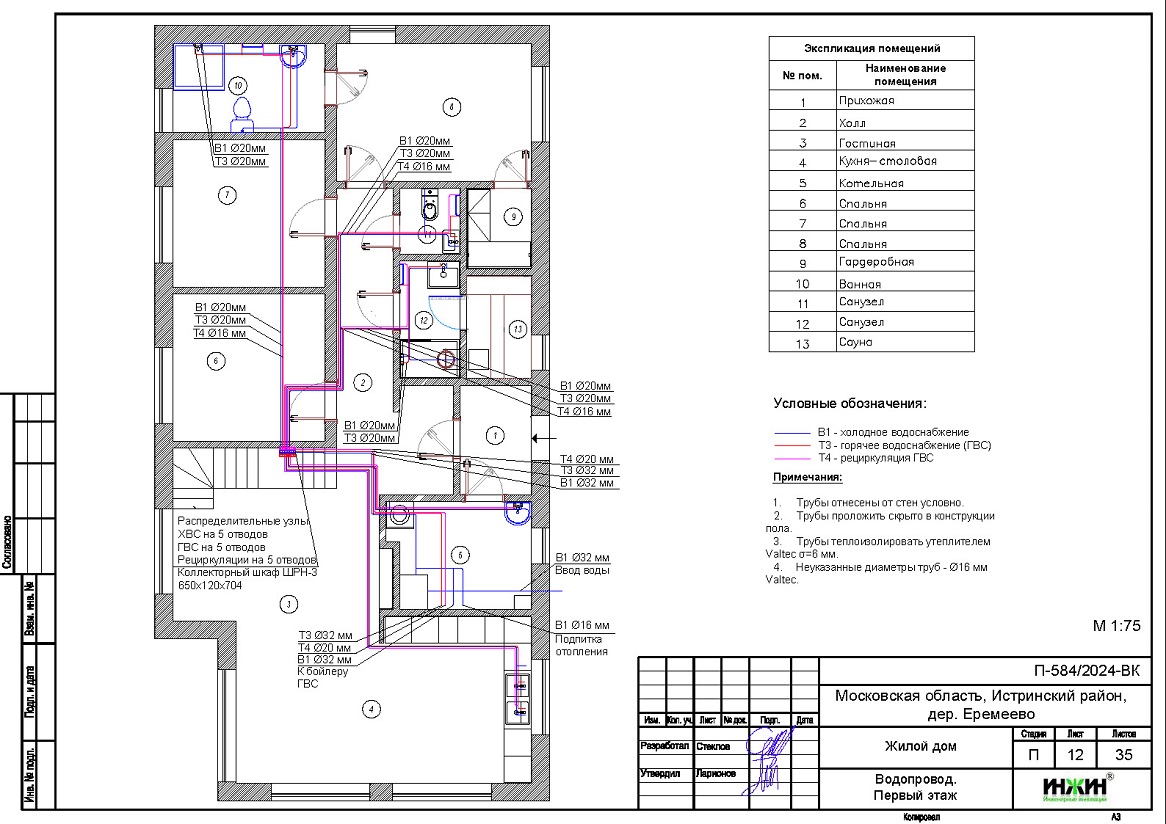 o Схема внутреннего водоснабжения дома – коллекторно-лучевая с рециркуляцией горячей воды через водяные полотенцесушители, выполнен расчет 23-х точек водоснабжения и полотенцесушителей;