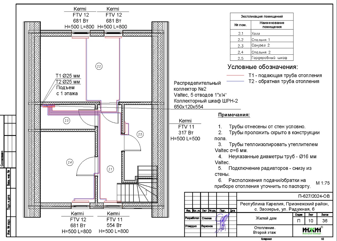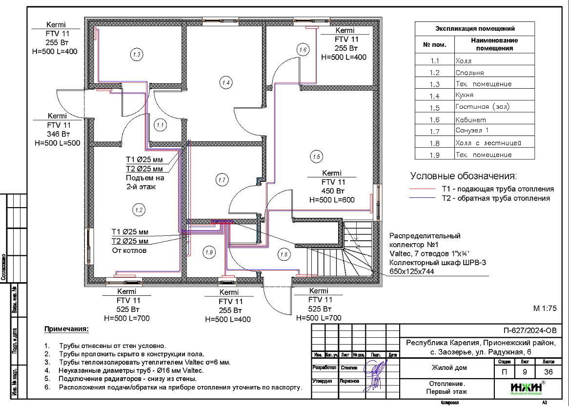 Объем проекта отопления и водоснабжения дома в с. Заозерье, Республика Карелия: 36 листов.