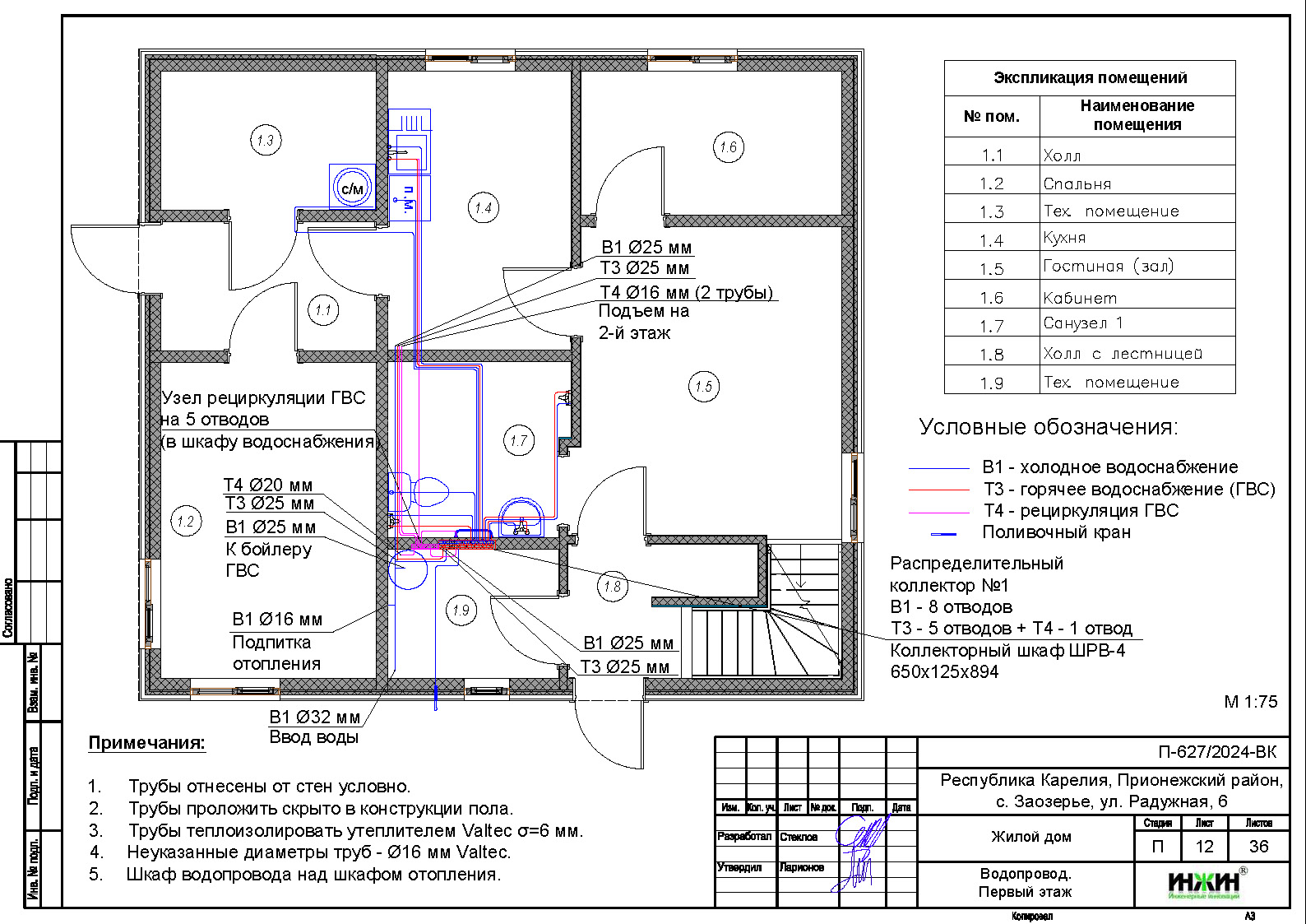 o Схема внутреннего водоснабжения дома – коллекторно-лучевая с рециркуляцией горячей воды через водяные полотенцесушители, выполнен расчет 20-ти точек водоснабжения и полотенцесушителей;