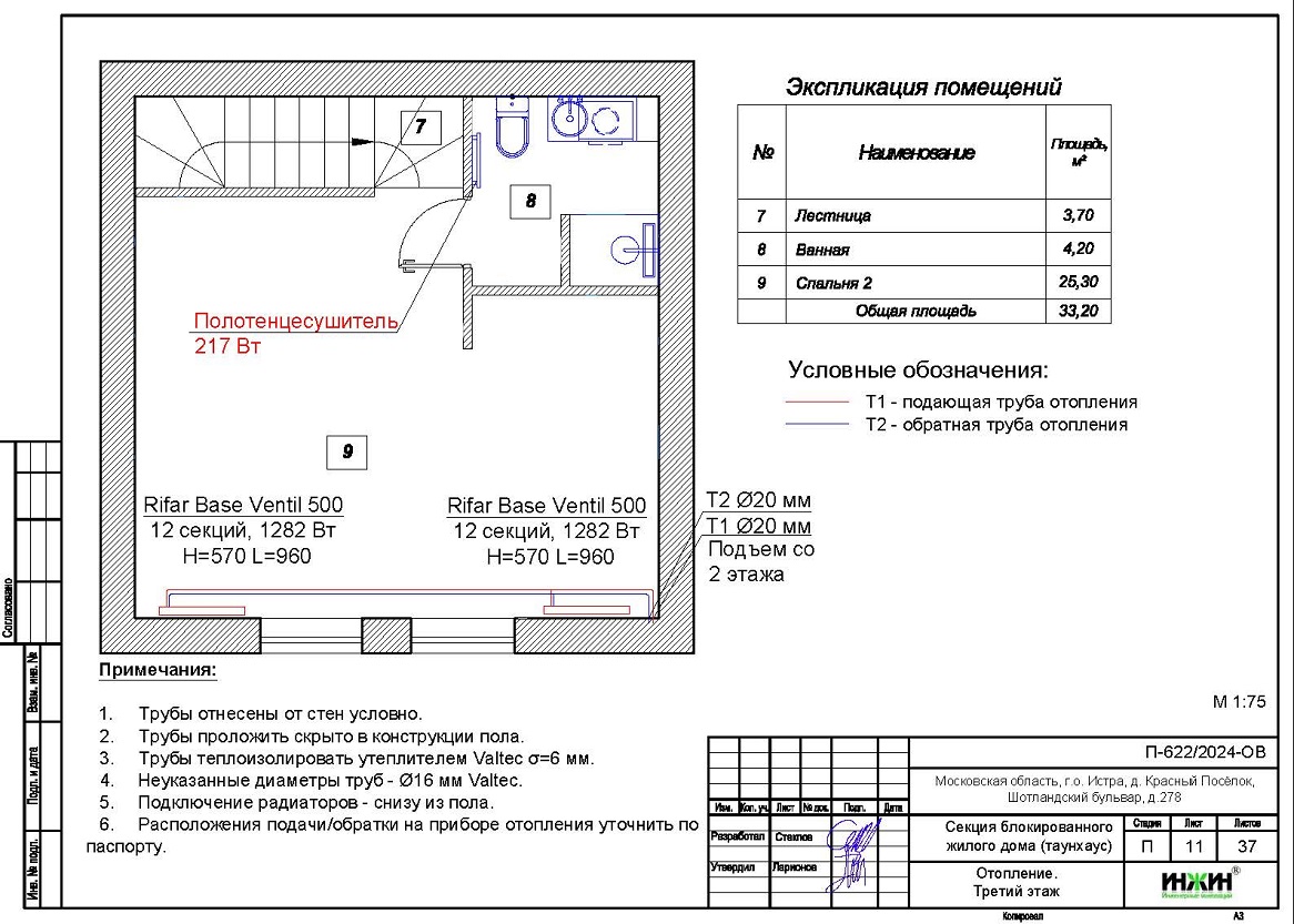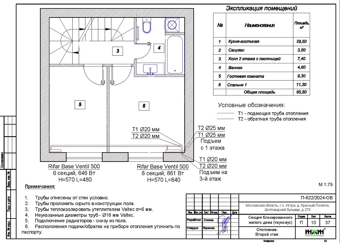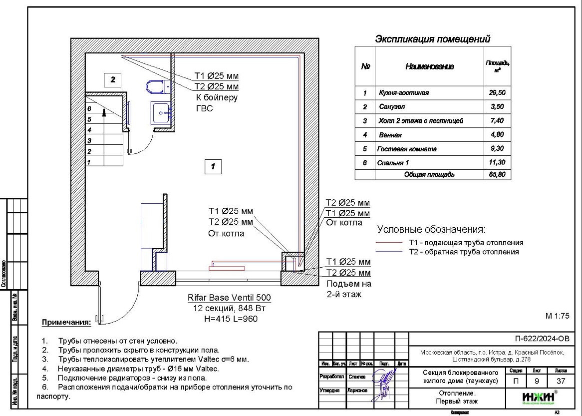 Объем проекта отопления, канализации и водоснабжения таунхауса в КП "Кембридж": 37 листов.