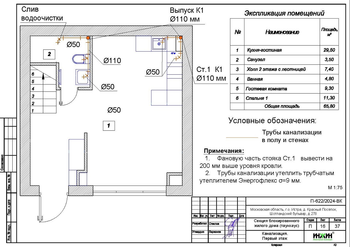 Внутренняя канализация (проект канализации) таунхауса в КП "Кембридж".