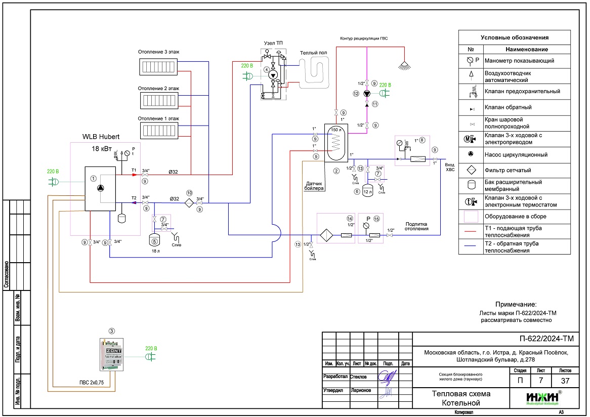 o Контуры теплоснабжения котельной – отопление и теплый пол, горячее водоснабжение, для которого предусмотрен накопительный бойлер STOUT, объемом 150 литров;