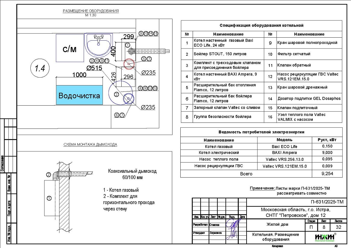Состав проекта котельной, отопления и водоснабжения дома в СНТГ "Петровское" Московской области: