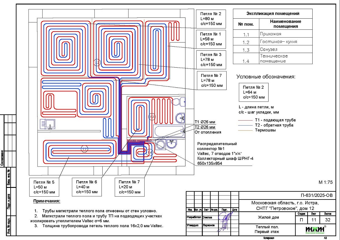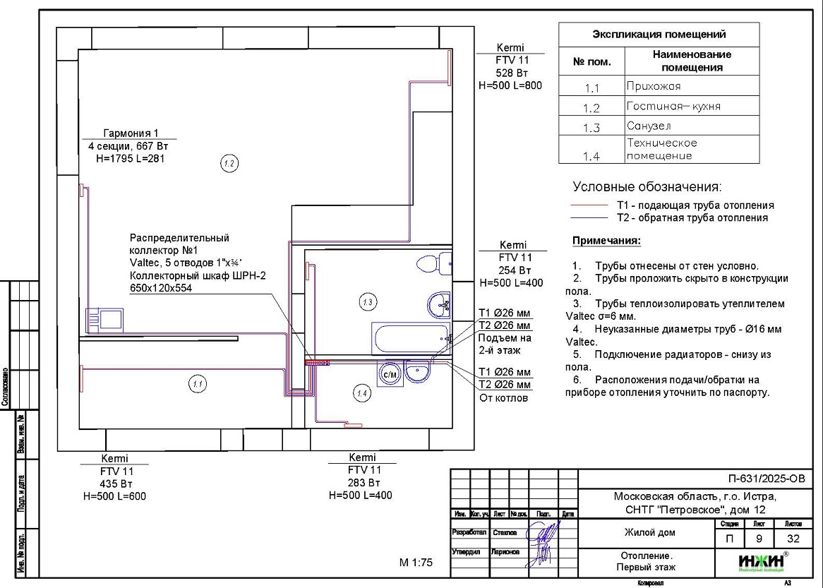 Объем проекта отопления и водоснабжения дома в СНТГ "Петровское" Московской области: 32 листа.