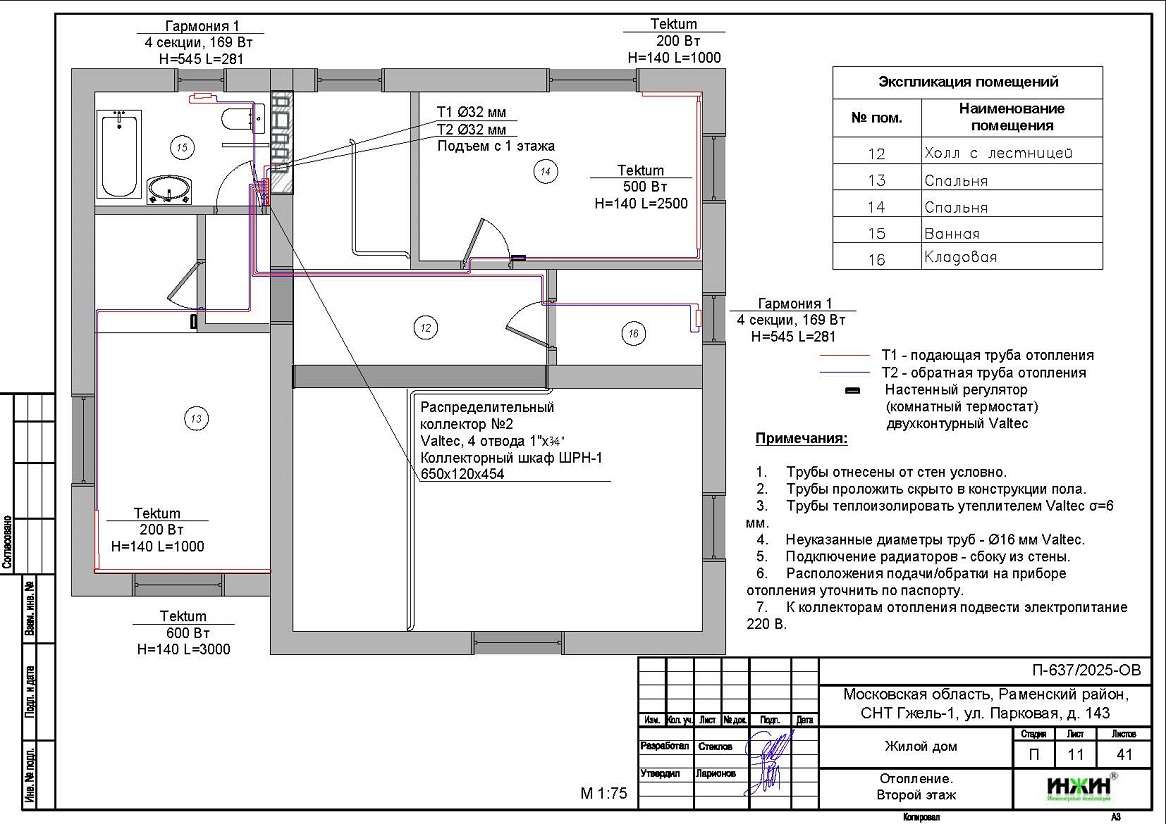 o Схема радиаторного отопления дома двухтрубная, коллекторно-лучевая, с принудительной циркуляцией теплоносителя и температурным графиком 80/60°С;