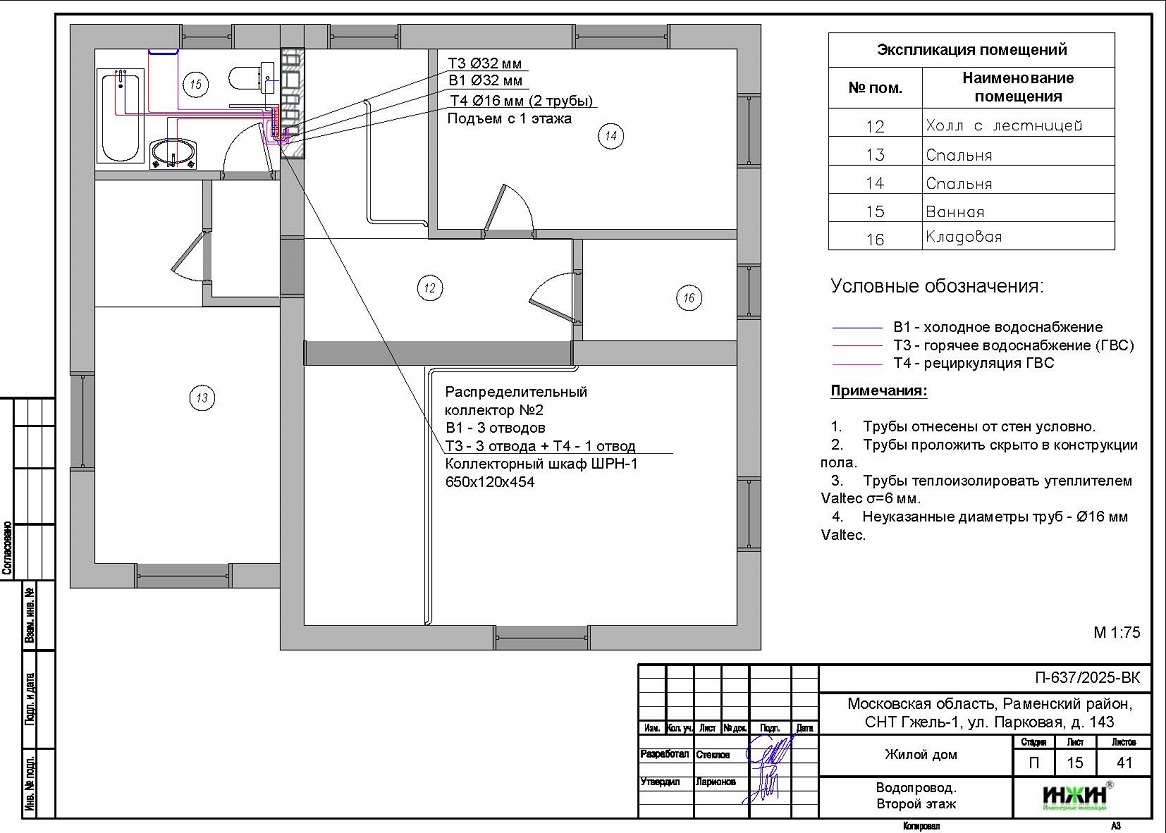 o Схема внутреннего водоснабжения дома – коллекторно-лучевая с рециркуляцией горячей воды через проходные водорозетки, выполнен расчет 17-и точек водоснабжения и полотенцесушителей;
