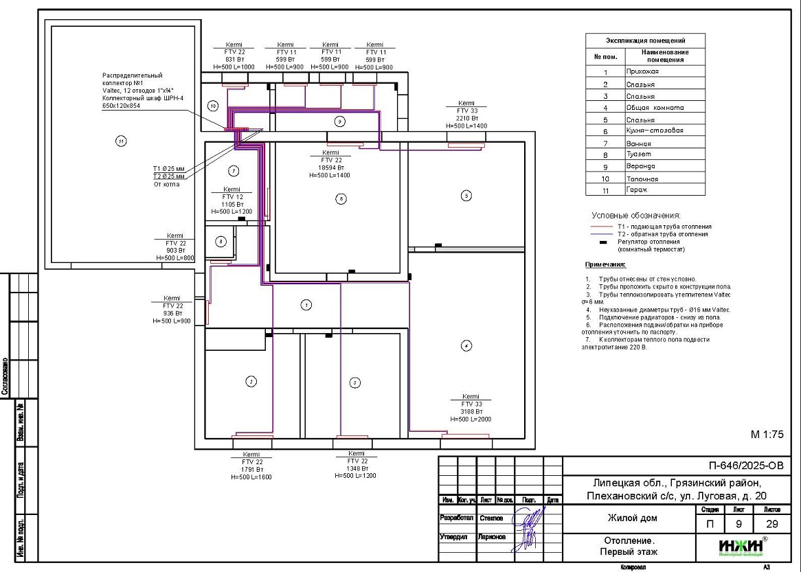 Объем проекта отопления дома в Плехановском с/с Липецкой области: 29 листов.