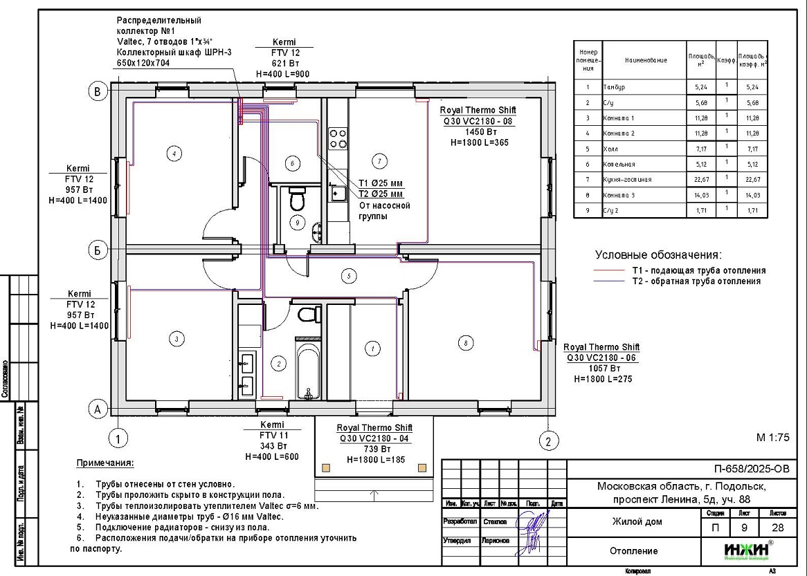 Объем проекта отопления дома в г. Подольск: 28 листов.