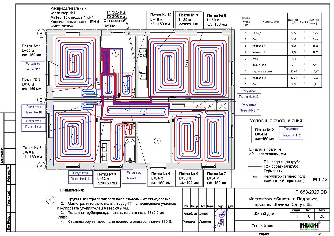 o Водяной теплый пол в доме предусмотрен на площади 70 м.кв., коллектор теплого пола Valtec на 10 отводов, всего 10 петель;