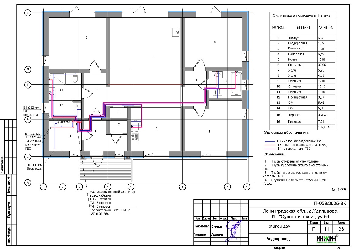 o Схема внутреннего водоснабжения дома – коллекторно-лучевая с рециркуляцией горячей воды через проходные водорозетки, выполнен расчет 16-ти точек водоснабжения и полотенцесушителей;