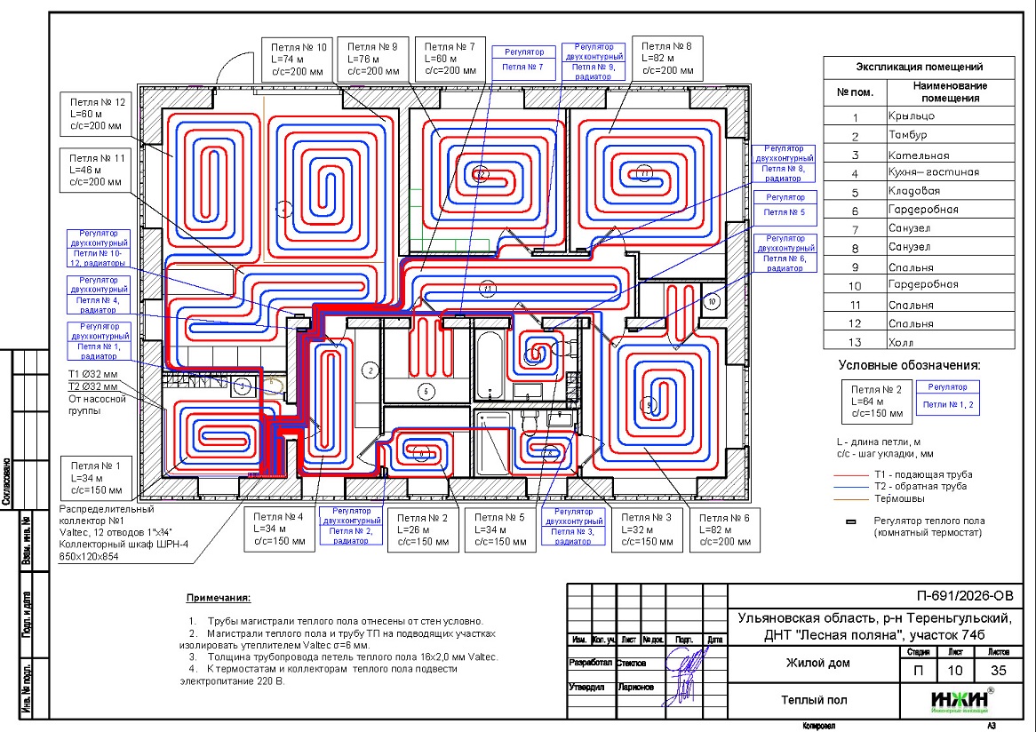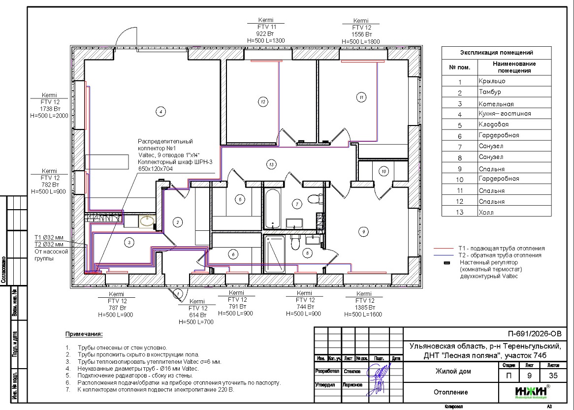 Объем проекта отопления и водоснабжения дома в ДНТ "Лесная поляна" Ульяновской области: 35 листов.