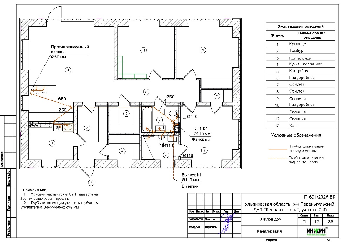 Внутренняя канализация (проект канализации) дома в ДНТ "Лесная поляна" Ульяновской области.