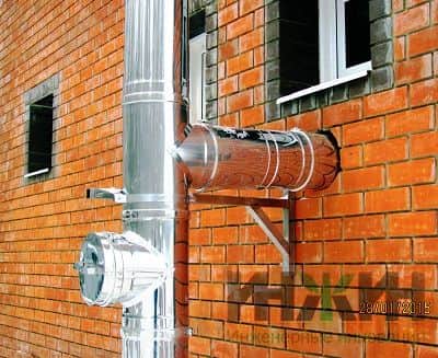 При невозможности реализовать классический дымоход с выходом на кровлю – единственный вариант. Оправдан при ограниченности места в котельной.