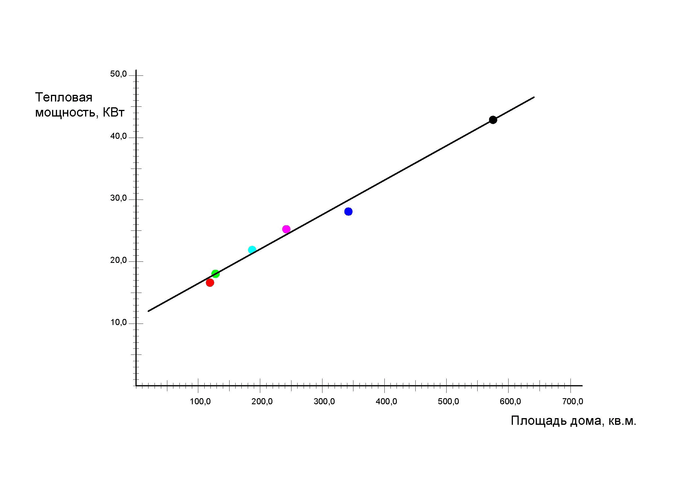 Опорными точками показаны теплопотери реализованных проектов систем отопления, проектирование и монтаж которых выполнен специалистами нашей компании. Нетрудно видеть, что удельная мощность системы отопления снижается со значения 127 Вт/м2 для домов меньшей площади (100-150 м2) до 85-80 Вт/м2 для домов площадью 400-500 м2, что несколько не соответствует шаблонной величине 100 Вт/м2, которую обычно используют для предварительного подбора оборудования.