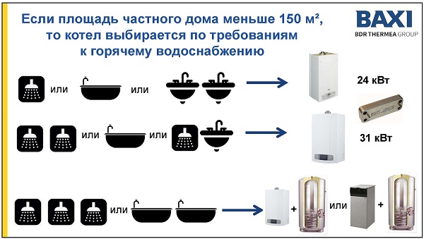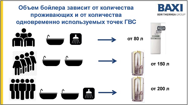 По рекомендации BAXI - это возможно для домов площадью менее 150 м.кв., с одним санузлом и кухонной мойкой. От себя добавим - и без рециркуляции горячей воды. Таким образом, если санузлов более одного, или нужна рециркуляция горячей воды - рекомендуется использование накопительного бойлера определенного объема.