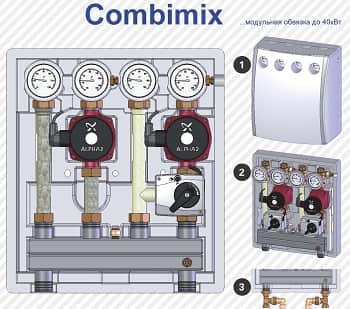 Модули Combimix предназначены для теплоснабжения 2-х отопительных контуров суммарной мощностью до 40кВт. Дополнительно модули комплектуются отводами для подключения контура бойлера ГВС.