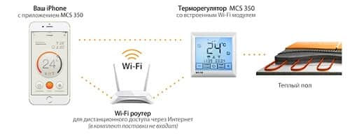 Встроенный Wi-Fi модуль позволяет включать в домашнюю сеть до 32-х регуляторов, а также управлять работой терморегулятора напрямую со смартфона. Для этой цели разработано специальное приложение для различных операционных систем MCS350. Указанное приложение позволяет контролировать параметры и управлять работой систем обогрева в разных помещениях (гостиная, спальня, кухня, детская и т.п.) нескольких жилых объектов (квартира, дом, дача). Установив приложение MCS 350, пользователь может контролировать работу 32-х зон обогрева (каждая система должна быть подключена к терморегулятору MCS).