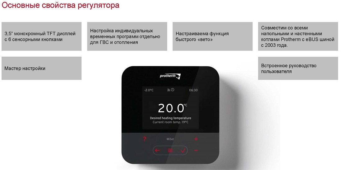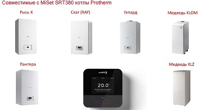 Новый регулятор MiSet совместим со всеми котлами Protherm, оснащенными цифровой шиной eBUS (выпускаются с 2003 года), электрическими Скат, газовыми настенными Рысь (конденсационный), Гепард и Пантера, напольными Медведь.